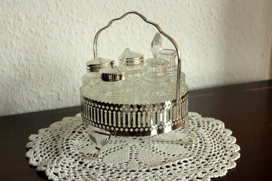Vintage Mid-Century metalen en glazen olie- en azijnstel met peper- en zoutstel, glazen voor azijn, olie en kruiden, en een metalen dienblad. Retro keuken uit de jaren 60 - Set van metalen en glazen olie- en azijnstel in uitstekende vintage staat met minimale tekenen van ouderdom en gebruik - ziet er ongebruikt uit.