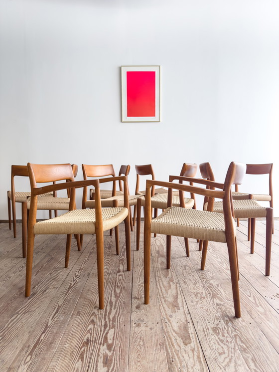 De set bestaat uit 8× model 77, Møllers klassieke Esszimmerstuhl met kleinere, organischer vorm, en 2× model 57 met armleuningen - een deutlich seltenere variant met een bijzonder elegant, sculpturaal silhouet en hoog zitcomfort.