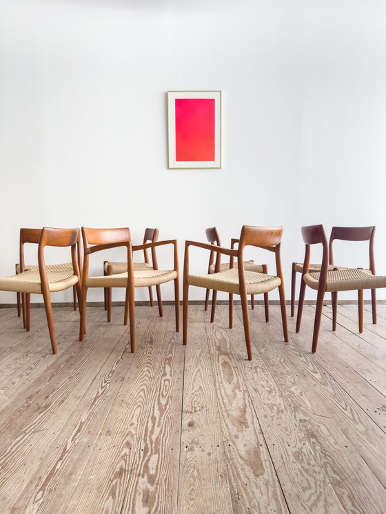 De set bestaat uit 6× model 77, Møllers klassieke Esszimmerstuhl met kleinere, organischer vorm, en 2× model 57 met armleuningen - een deutlich seltenere variant met een bijzonder elegant, sculpturaal silhouet en hoog zitcomfort.