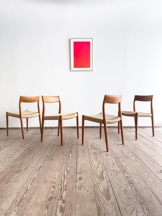 Deze originele set van vier eetkamerstoelen is ontworpen door de beroemde Deense ontwerper Niels O. Møller en werd in de jaren 60 geproduceerd door J.L. Møller's Møbelfabrik in Denemarken. Het is model #77, een van de meest iconische werken van Møller - bekend om zijn minimalistische ontwerp, elegante proporties en meesterlijk vakmanschap.