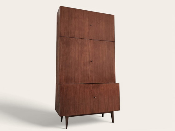 Prachtig Mid Century vintage highboard uit de jaren zestig. Het highboard heeft een natuurlijke Scandinavische uitstraling door het strak vormgegeven design en het gebruik van pallisander fineer. De kast staat op een houten onderstel met taps lopende houten poten. De kast bestaat uit drie modules die op elkaar staan. Alle drie de kasten beschikken over twee deuren met slot. In totaal bevinden er zich vier planken in de kast, allen in hoogte verstelbaar.