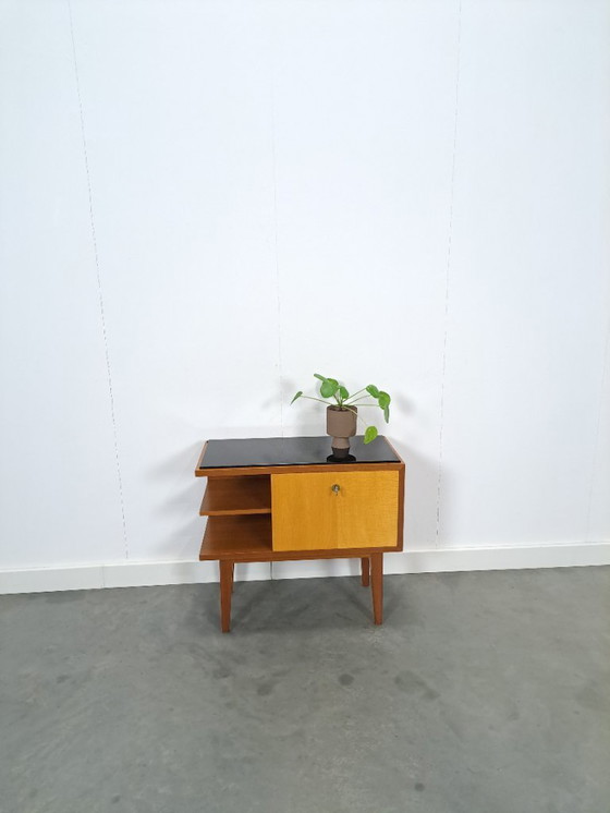 Vlot vintage kastje. Het kastje is uitgegeven door J.D. Freese Oldenburg en is leuk te gebruiken als nachtkastje of in de woonkamer. Het kastje heeft een vak met klepdeur, een open gedeelte met planken en een zwart glazen blad van opaline glas.
