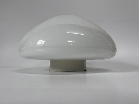 Deze prachtige Mid Century Wilhelm Wagenfeld Mushroom lamp is een iconisch stuk dat zowel aan het plafond als aan de wand kan worden gemonteerd. Het ontwerp is typerend voor de Mid Century Modern stijl, met een elegante, paddenstoelvormige kap van glas die een zachte, diffuse verlichting biedt. Het armatuur is gemaakt van kunststof en kan lichte verkleuring hebben. De lamp is een voorbeeld van tijdloos design. Perfect voor liefhebbers van vintage en designklassiekers.