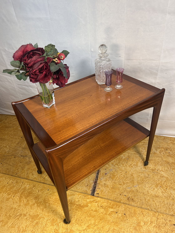 Verhoog uw entertainment met deze stijlvolle serveertrolley uit de Mid Century, gemaakt van rijk teakhout met elegante afromosia randen, een klassiek voorbeeld van een Deens geïnspireerd ontwerp uit de jaren 1960. Met zijn strakke lijnen, warme houttinten en slanke silhouet voegt dit stuk een verfijnde vintage touch toe aan elke ruimte.