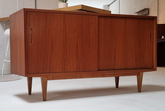 Een prachtig vintage sideboard uit de jaren zestig, geproduceerd in Denemarken. Het strakke design en het hoogwaardige teakfineer geven dit meubel de kenmerkende natuurlijke Scandinavische uitstraling.