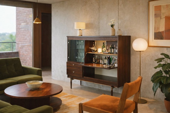 Elegant mid-century sideboard uit de jaren 1950–60, uitgevoerd in donker houtfineer met een verfijnde Griekse meanderdecoratie in de bovenlijst. Het meubel combineert gesloten bergruimte met een glazen vitrine en een neerklapbare bar-/serviesdeur, ondersteund door originele metalen stay-arms.