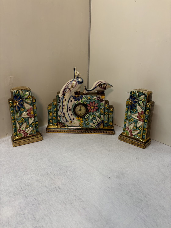 Stap in de elegantie van het Art Deco tijdperk met deze prachtige Belgische pendule set. Deze boeiende klok is gemaakt van fijn keramiek en is versierd met levendige bloemmotieven en ingewikkelde details die de kunstzinnigheid van die tijd laten zien. Het middenstuk is voorzien van een prachtig gebeeldhouwde pauw, die een gevoel van grandeur en verfijning toevoegt aan het ontwerp. Perfect voor verzamelaars of mensen die op zoek zijn naar een uniek decoratief element voor hun huis, bevat deze klokkenset twee bijpassende zijstukken, elk rijkelijk versierd met kleurrijke bloemmotieven en gouden accenten. Verfraai je leefruimte met dit tijdloze stuk en laat de artistieke flair je gasten betoveren.