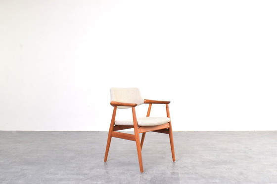 Dit model behoort tot een groep stoelen en fauteuils van Eriksen die gekenmerkt worden door een lichte, open structuur. De gevormde armleuningen en de licht achteroverleunende rugleuning zorgen voor een comfortabele en natuurlijke zithouding. Het frame, zoals te zien op de foto, is gemaakt van massief teakhout – een materiaal dat vanwege zijn duurzaamheid en stabiliteit veelvuldig werd gebruikt in Deense meubels uit die periode.