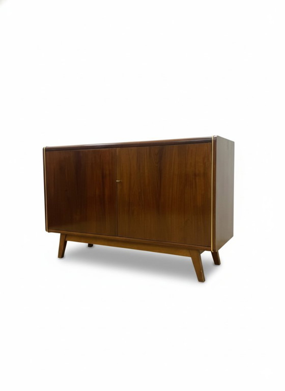 Deze elegante kast uit het midden van de vorige eeuw werd ontworpen door Bohumil Landsman en geproduceerd door Jitona Soběslav in de Tsjechoslowaakse Socialistische Republiek in de jaren 60. Het is een prachtig voorbeeld van Tsjechisch design in Brusselse stijl, bekend om zijn verfijnde lijnen, praktische vormgeving en hoogwaardige vakmanschap.