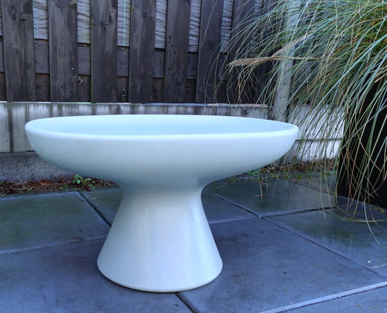 Vorm: Het tafeltje volgt de organische, vloeiende lijnen van de stoelen, met ronde vormen die het futuristische, bijna sculpturale karakter van de rest van het set-ontwerp versterken.