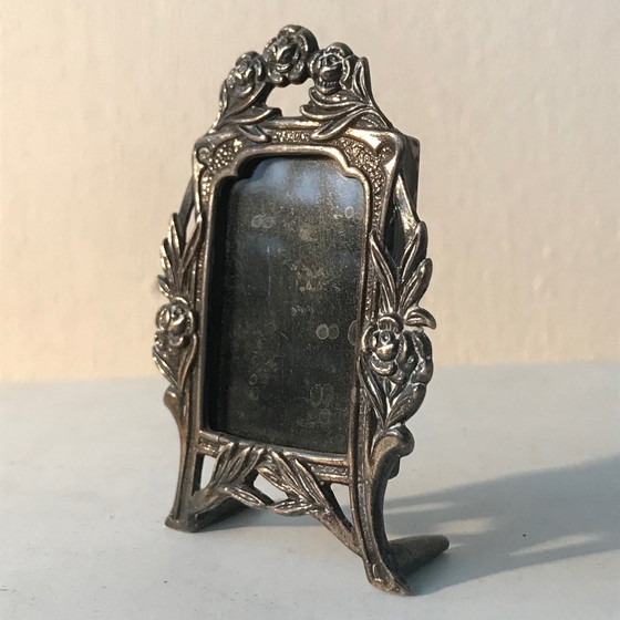 Mini verzilverd sta fotolijstje met mooie pootjes en roosjes bloemenrand.