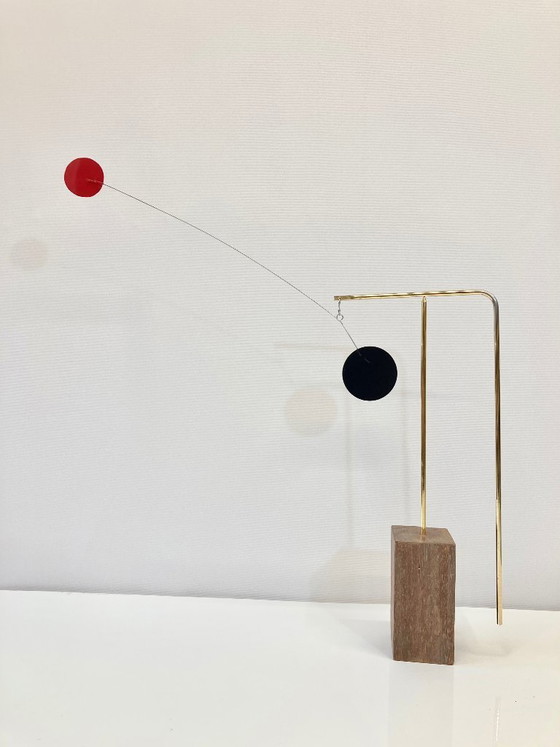 Ontdek de subtiele elegantie van de Minimal Mobile, Nr. 1. Dit kunstwerk is een perfecte balans tussen eenvoud en verfijning, en voegt een vleugje moderne kunst toe aan elke ruimte. De mobiele structuur is zorgvuldig ontworpen om een gevoel van beweging en evenwicht te creëren, waardoor het een fascinerend middelpunt wordt in uw interieur.