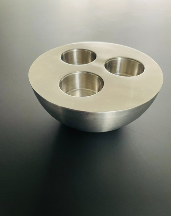 Minimalistische kaarsenhouder van geborsteld RVS, geschikt voor drie waxinelichtjes. Compact ontwerp met verzonken houders.