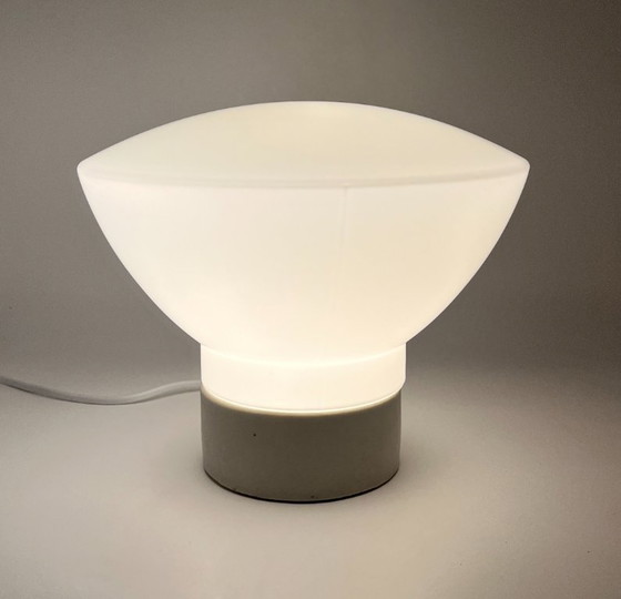 Een tijdloze, ingetogen lamp van wit porselein met een gesatineerde opaalglazen kap. Het strakke, geometrische silhouet doet denken aan Scandinavische industriële en Bauhaus-verlichting uit de jaren 60 en 70. Ideaal voor minimalistische interieurs, lofts en designgerichte architecturale omgevingen.