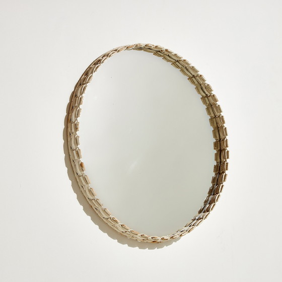 Ronde spiegel met houten lijst en rieten details uit de jaren 1970. Verfslijtage op sommige plekken op de lijst van de spiegel. Afmetingen: 50 × 4,5 x 50 cm