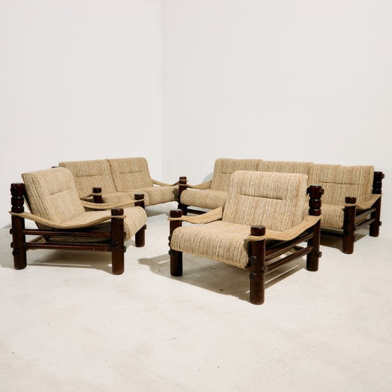 Bankstel ‘Björn’ uit de jaren 70, ontworpen door Aleksander Kuczma. De set bestaat uit een driezitsbank, een tweezitsbank en twee fauteuils. Het frame is gemaakt van massief grenenhout met comfortabele bekleding en met textiel beklede armleuningen. De houten en textiele oppervlakken van de set vertonen krassen, vlekken en slijtageplekken, met gebruikssporen. Afmetingen: Driezitsbank: 203x70x90 cm, Zithoogte: 35 cm /// Tweezitsbank: 153x70x90 cm, Zithoogte: 35 cm /// Fauteuil: 83x70x90 cm, Zithoogte: 35 cm