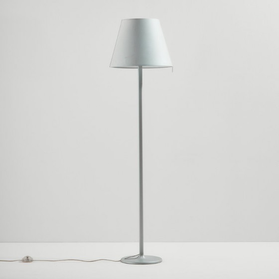 De ‘Melampo Terra’ vloerlamp, ontworpen door Adrien Gardère voor Artemide in de jaren 2000. Dankzij het ontwerp en de materialen is deze lamp elegant en tijdloos, met een aluminium frame en een satijnen kap. Het praktische ontwerp heeft een lampenkap die in drie standen verstelbaar is, waardoor hij perfect is voor het verlichten van de omgeving of het creëren van sfeerverlichting. Oppervlakte krassen, vlekken en slijtage op sommige plaatsen.