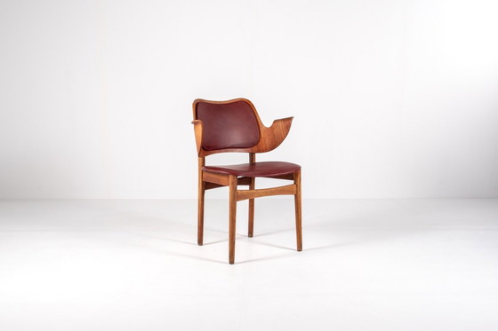 Deze sculpturale stoel heeft een prachtig gevormd frame van eikenhout met teakhouten elementen, waarmee Olsens kenmerkende organische ontwerpstijl en aandacht voor comfort tot uiting komen.