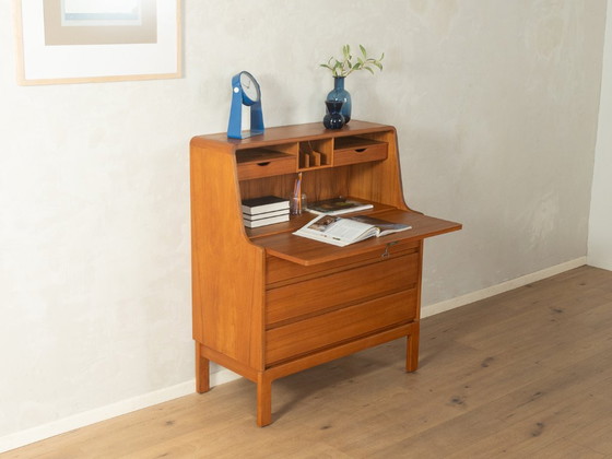 Elegant Deens bureau uit de jaren 60. De gerenommeerde ontwerper Arne Wahl Iversen ontwierp model 88 voor Vinde Møbelfabrik en creëerde daarmee een klassieker van het Scandinavisch modernisme. Achter de afsluitbare klep bevindt zich een slim gestructureerd interieur met kleine lades en vakjes, dat, eenmaal geopend, een praktisch werkblad biedt. Gemaakt van hoogwaardig teakhout in een warme, middeldonkere bruine tint, getuigt het bureau van meesterlijk vakmanschap. Het zorgvuldig gerestaureerde meubelstuk verkeert in zeer goede vintage staat.