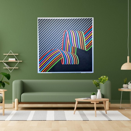 Dit kleurrijk schilderij is een echte eyecatcher en past perfect in een modern interieur, kantoor of galerie. De strakke compositie en het ritme van de lijnen geven het werk een hypnotiserend effect. Ideaal voor liefhebbers van abstracte kunst, geometrische schilderijen en optisch spel in design.