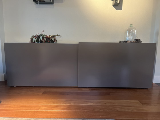 Heel mooi modern en strak dressoir (Easy going) in de kleur taupe / grijs. Dressoir bestaat uit twee elementen die over elkaar / onder elkaar schuiven.