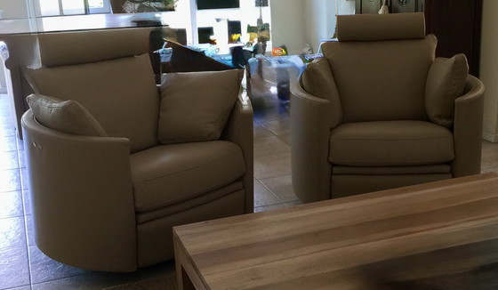 Set van twee comfortabele, draaibare fauteuils. De fauteuils zijn in goede staat en bieden een heerlijke zitervaring. Ze zijn bekleed met leer en hebben een moderne uitstraling. Ideaal voor de woonkamer of studeerkamer.