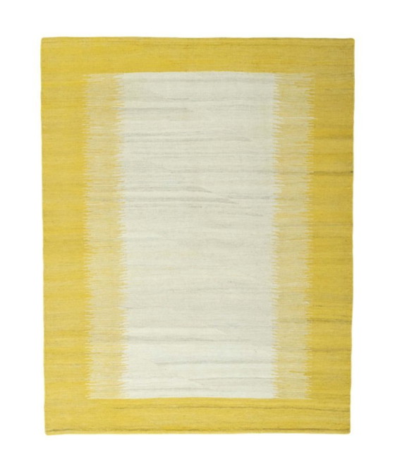 Deze moderne handgeweven design kelim combineert minimalistisch design met traditioneel vakmanschap. Het harmonieuze samenspel van warmgeel en zachtcrème creëert een vriendelijke, tijdloze sfeer in elke kamer. Ideaal voor moderne, Scandinavische of minimalistische interieurs.