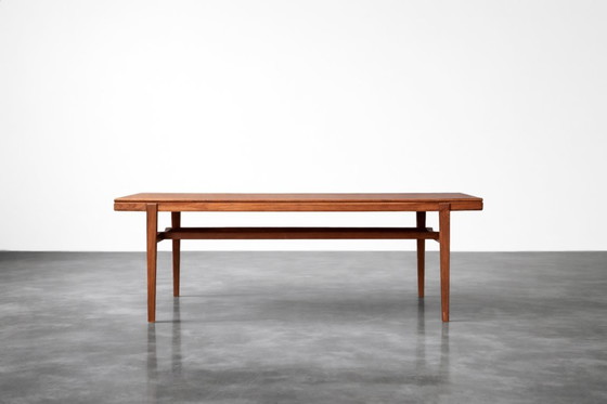 Deze Cosmos salontafel is ontworpen door Sven Engström en Gunnar Myrstrand voor de Zweedse meubelmakerij Tingströms in de jaren 60. De tafel is gemaakt van teakhout, dat extreem bestand is tegen invloeden van buitenaf en zijn lange levensduur vooral te danken heeft aan een specifieke samenstelling, rijk aan olieachtige stoffen en kiezelzuur. De tafel heeft een eenvoudige vorm die kenmerkend is voor de designideeën van het Mid-Century Modern tijdperk.