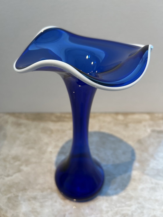 Een puntgave mondgeblazen vaas van kobaltblauw glas met een witte rand. De vaas is afkomstig uit de voormalige DDR of Polen. Gemaakt rond 1970/1980. Een prachtige zwierige en elegante vaas.