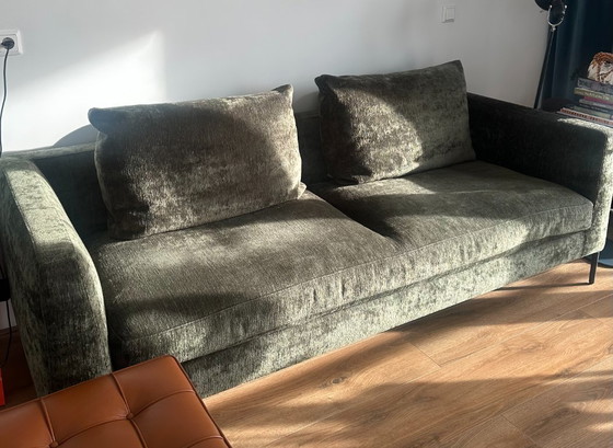 Ervaar ultiem comfort en stijl met de Montis 3-zits bank 'Daley'. Deze prachtige bank, bekleed met een rijke groene stof, straalt moderne elegantie uit en biedt een uitnodigende plek om te ontspannen. Het strakke ontwerp wordt geaccentueerd door de subtiele metalen poten.