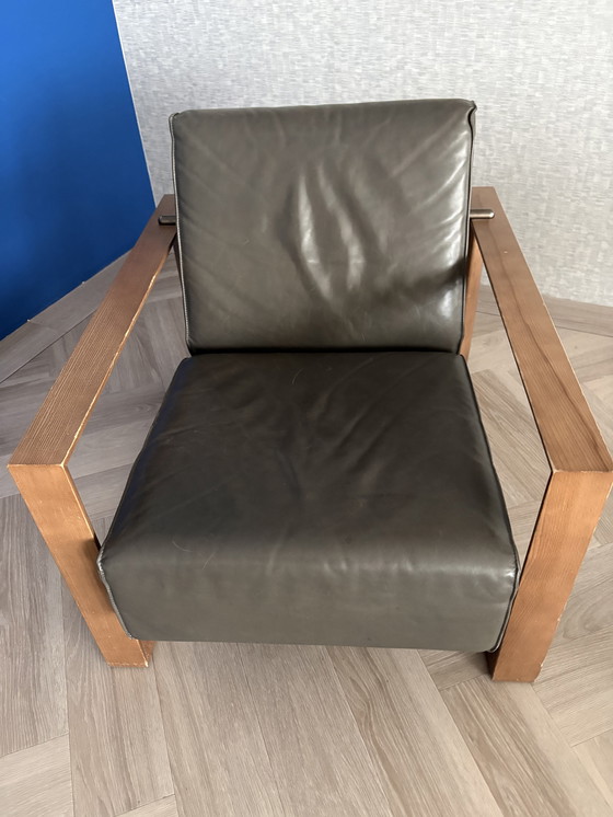 De moderne interpretatie van grootvader’s jaren 50 rookfauteuil die met het stokje verstelbaar was. Deze luxe comfortabele designfauteuil kan je verstellen zonder op te staan. Uitgevoerd in antraciet leer en solide eikenhouten frame. In het eerste aanzien, ziet de stoel er perfect uit. Echter het houtwerk heeft wat beschadigingen die totaal niet opvallen.