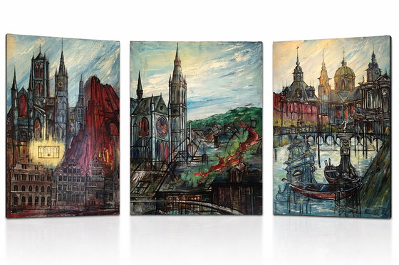 Alle drie de werken hebben dezelfde afmetingen (100 × 80 cm), waardoor ze ideaal zijn om als drieluik of als een evenwichtige architectonische compositie in een verfijnd interieur te plaatsen. Samen vormen ze een krachtig visueel verhaal, geworteld in de naoorlogse Europese expressie en stedelijke verbeelding.