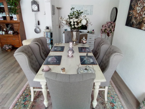 Ervaar de charme van het landelijke leven met deze prachtige eetkamer set. Deze set, met zijn rustieke uitstraling, brengt een warme en uitnodigende sfeer in uw eetkamer. De combinatie van taupe stoelen en een witte tafel zorgt voor een tijdloze elegantie die perfect past in zowel moderne als traditionele interieurs.