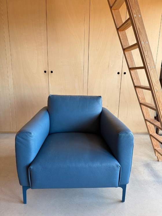 Zeer fraaie fauteuil van ontwerper Bert Plantagie. Deze Adore fauteuil is bekleed met een topkwaliteit blauw leer en heeft een comfortabele zitpositie. Dit exemplaar is in nieuwstaat.