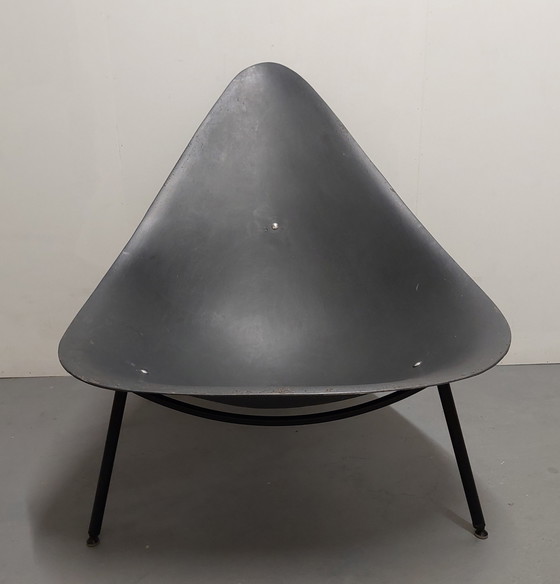 Het frame is metaal zwart, de schaal is van fiberglas/polyester, deze heeft een mooie vezelstructuur aan de achterkant.