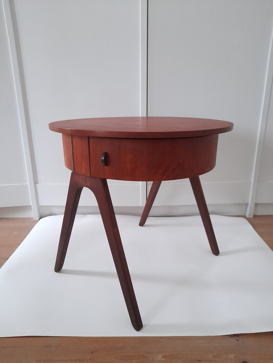 Charmant klein bijzettafeltje/werktafeltje. Gemaakt in Denemarken, jaren 60. Prachtig vervaardigd uit teakhout, met schuin aflopende poten en twee draaibare lades met messing handgrepen. In uitstekende staat.