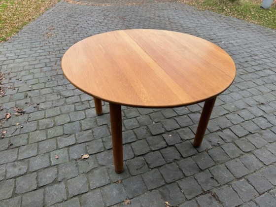 Eettafel , volledig massief eik, geen fineer! In ronde vorm diameter 120 cm. Gemakkelijk uitbreidbaar tot 170 cm of 220 cm. Tafel uit jaren 90 van Heden team die destijds een design prijs heeft gewonnen gewonnen.