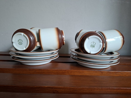 Ontdek de tijdloze charme van deze Mosa Maastricht keramiek set, bestaande uit zes prachtige kopjes en schoteltjes. Deze vintage set straalt elegantie uit met zijn klassieke bruine en witte kleurenschema, perfect voor elke gelegenheid.