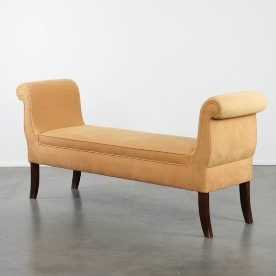 Dit geweldige meubel zal met zijn tijdloze charme zich gemakkelijk laten plaatsen in nagenoeg ieder interieur. Bijvoorbeeld in de hal, bij het raam of aan het voeteneind van een bed komt hij perfect tot zijn recht. Hij heeft een prachtig mosterdgele kleur en is uitgevoerd in een luxe stof. Zijn omgekrulde armleuningen en charmante poten geven hem een sierlijke en elegante uitstraling. Door verantwoord gebruik heeft hij enkele minimale gebruikssporen opgelopen. Structureel is hij in goede, correcte en uiteraard direct inzetbare staat, en bij gepast gebruik en onderhoud kunt u nog vele jaren van dit fijne bankje genieten. Staat dit meubel binnenkort bij u in huis?
