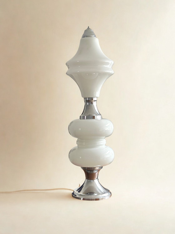 De lamp bestaat uit drie sculpturale elementen van handgeblazen opaalwit Murano-glas, verbonden door een structuur van verchroomd staal. Het futuristische ontwerp, met drie ringvormige secties, verwijst naar het Atomic Age-tijdperk en de fascinatie voor ruimteverkenning in de jaren 1960 en 1970.