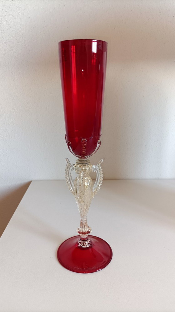 Ervaar de elegantie van Venetiaans vakmanschap met deze prachtige Muranoglazen bokaal van Nason Moretti. De levendige rode tint van het glas wordt gecompleteerd door complexe transparante details, die het meesterschap van traditionele glasblaastechnieken tonen. Dit stuk is niet alleen een bewijs van het rijke erfgoed van Muranoglas, maar ook een opvallende toevoeging aan elke verfijnde tafelsetting.