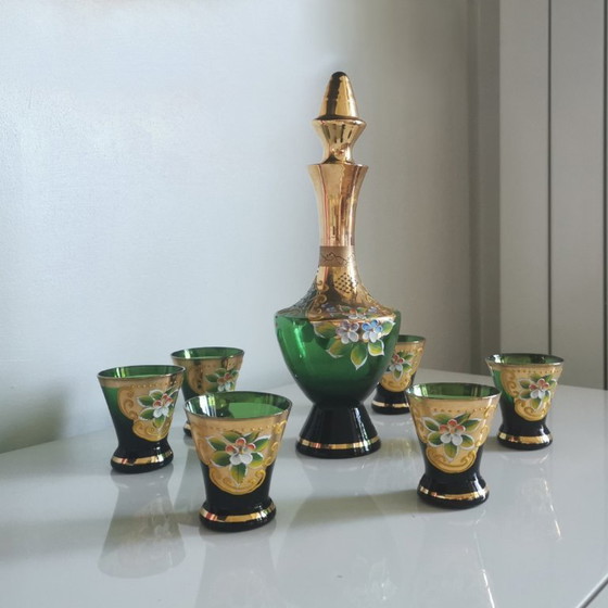 Fles en 6 glazen van Murano glas in groene kleur. In perfecte staat, zonder deuken, barsten of beschadigingen, en zonder slijtage aan het goud. Afmetingen: zie foto's. Zonder label of certificaat van echtheid.