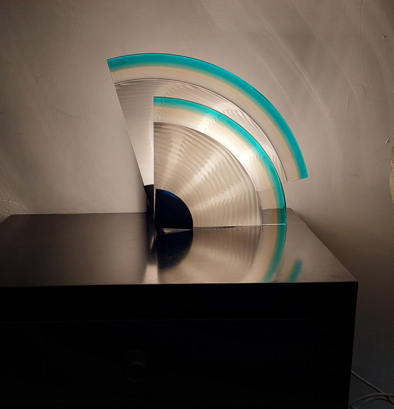 Verlicht uw ruimte met de prachtige Mid Century Murano wandlamp van Leucos. Dit schitterende exemplaar combineert de elegantie van Murano-glas met een strak, modern design, perfect om een vleugje verfijning aan elke kamer toe te voegen. De transparante en turquoise tinten van de lamp creëren een betoverend lichtspel en versterken de sfeer in uw huis. Ontworpen door de gerenommeerde Italiaanse ontwerper/architect Renato Toso. De glazen platen kunnen worden versteld om het licht te verbreden.