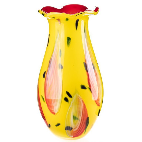 Deze Muranostijl vaas is een schitterend kunstwerk dat uw interieur verrijkt met zijn levendige kleuren en verfijnde uitstraling. De combinatie van geel en rood glas, met subtiele groene en zwarte accenten, maakt deze vaas tot een opvallend middelpunt in elke kamer. - Handgemaakt in de kenmerkende Muranostijl, wat zorgt voor een unieke en artistieke uitstraling. - De levendige kleuren en het elegante ontwerp maken het een perfecte aanvulling op zowel moderne als klassieke interieurs. - Deze vaas heeft geen boeket nodig om te stralen; zijn schoonheid spreekt voor zich. Voeg een vleugje verfijning toe aan uw huis met deze prachtige glazen vaas. Neem vandaag nog contact op voor meer informatie of om dit unieke stuk aan uw collectie toe te voegen.