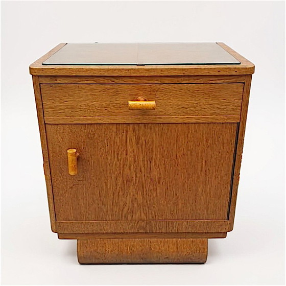Elegant Art Deco nachtkastje met een verfijnde glasplaat bovenop. Dit stuk combineert de warme uitstraling van hout met de luxe van glas, perfect voor een stijlvolle slaapkamer. De strakke lijnen en het unieke ontwerp maken het een tijdloze toevoeging aan je interieur.