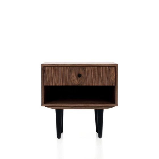 Dit fraai vormgegeven model is perfect als nachtkastje. We hebben het voorzien van één lade op Blum verborgen geleiders met het Blumotion-systeem. Dankzij dit systeem is het openen en sluiten van de lades een zeer licht en extreem stil proces. Daaronder bevindt zich een open plank waar u gemakkelijk hogere items of een hele toren aan leesvoer kunt opbergen.