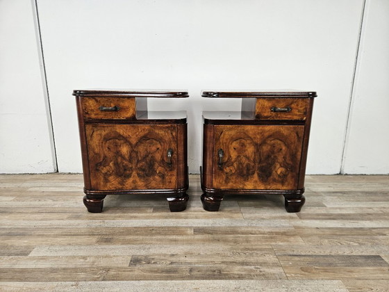 Een paar nachtkastjes in late Art Deco-stijl uit de jaren 50, volledig bekleed met wortelhout, met een lade en een deurtje.