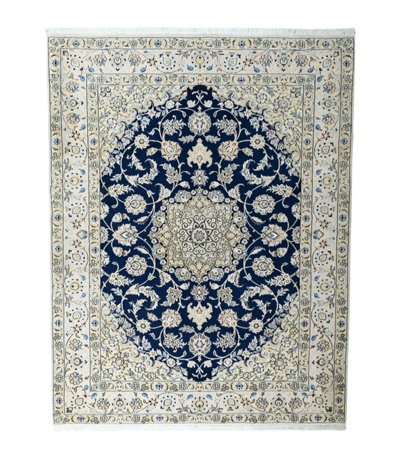 Een stijlvol, handgeknoopt Nain tapijt van fijne zijde dat indruk maakt door zijn klassieke elegantie en gedetailleerde details. Het centrale medaillon op een diep middernachtblauwe achtergrond wordt omlijst door florale arabesken en een fijn gecoördineerde ivoren rand - een kunstwerk in de traditionele kunst van het knopen.