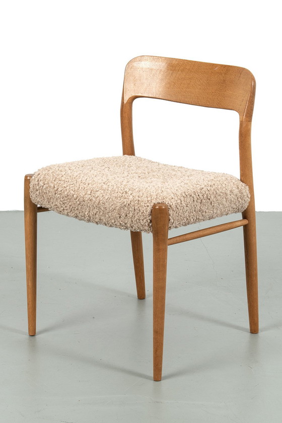 Niels Møller stoel model 75 in licht eiken uitvoering en met imitatie beige wol bekleed.In een goede vintage staat.