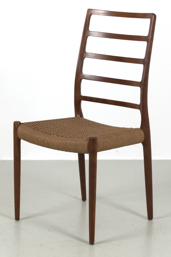 Geweldige stoel ontworpen door Niels Otto Møller voor J.L. Møllers uit Denemarken. Het frame van de stoel is gemaakt van teak hout met een zitting van touw. In een goede vintage staat.